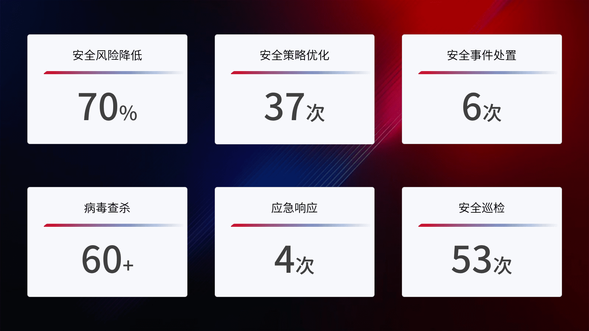 提供全面的安全事件报告体系,,,,包括处置报告、、、、周报、、季度和年度总结,,结合持续监控,,,帮助客户深入了解网络安全状况。。