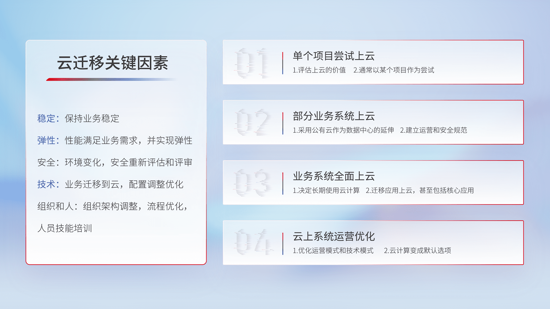 结合实际业务,,,从规划设计、、、云平台选型、、云原生改造、、数据迁移、、、集成交付,,,,迁移全过程为客户识别最佳上云路径,,,,做好风险识别管理,,,设计网络架构、、身份权限、、、、安全审计合规、、、操作审计、、、、日志审计、、、监控告警策略、、多站点容灾设计等,,对云上基础设施进行整体规划,,提升IT治理水平,,,以满足弹性、、高可用、、、高性能的需求。。。