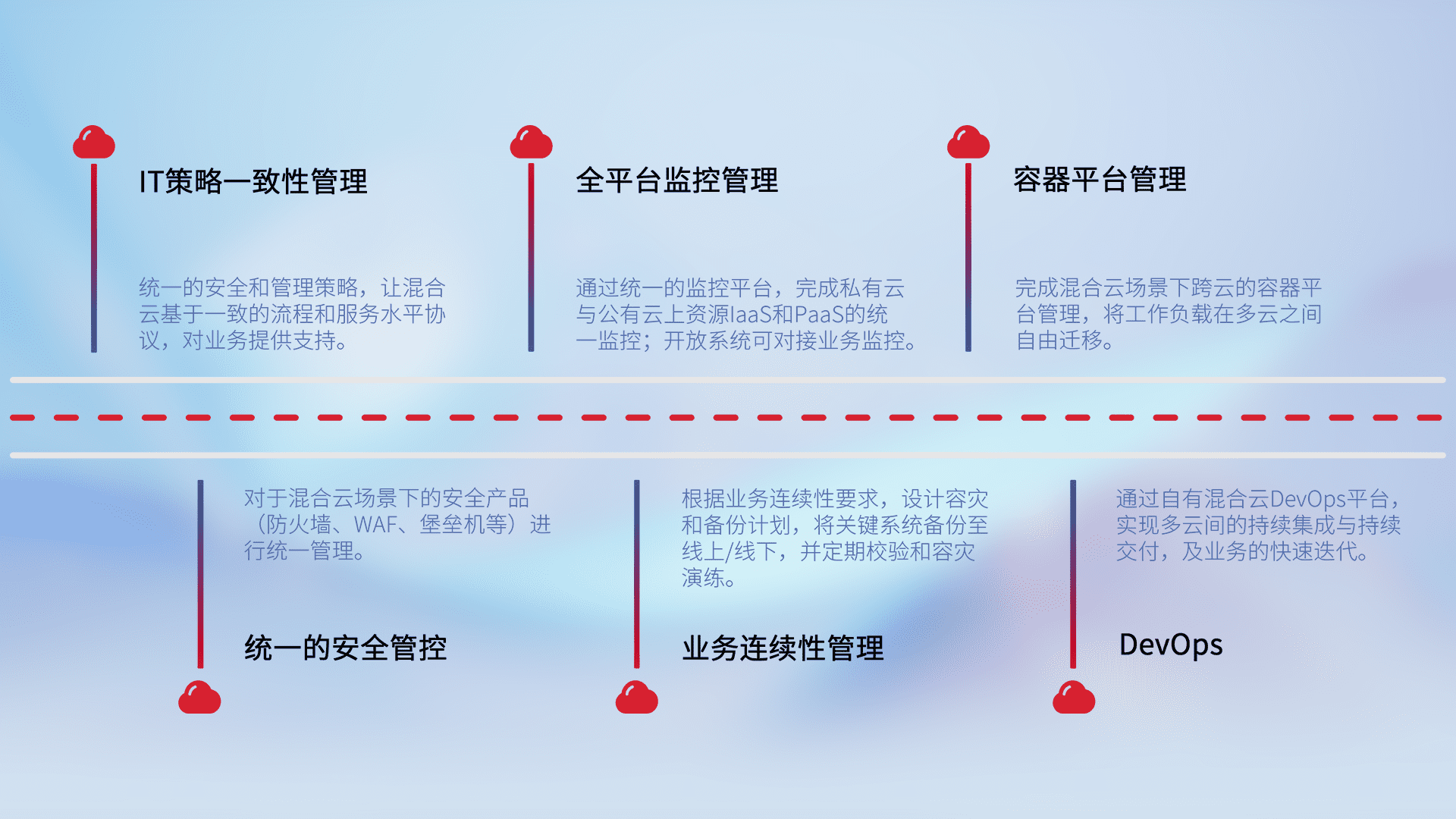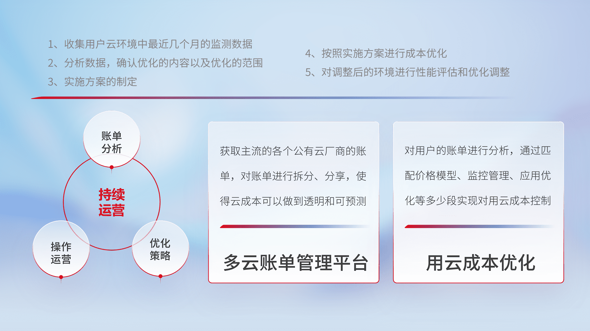 通过多云纳管,,以统一的资源数据模型把客户的云资源进行抽象和封装,,,进而实现对多云资源的统一操作,,保障云资源管理的可靠性、、、稳定性与可用性。。量身定制化运维内容,,,,配置、、开发运维、、、、补丁管理、、、备份、、、、监控、、、认证和访问管理、、、、审计和日常巡检等,,,,保障在用云过程中的可靠度,,,稳定度以及高可用率。。