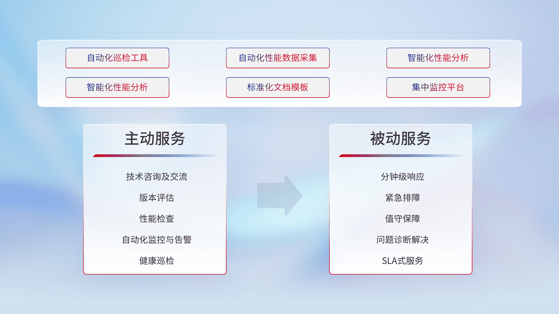 智能化工具和标准化文档,,,,保障服务质量,,,,提供主动服务(包含技术咨询、、、、版本评估、、、性能检查、、自动化监控与告警、、、、健康巡检)和被动服务包含(分钟级响应、、、、紧急排障、、、、值守保障、、、问题诊断解决、、、、SLA服务)。。。。